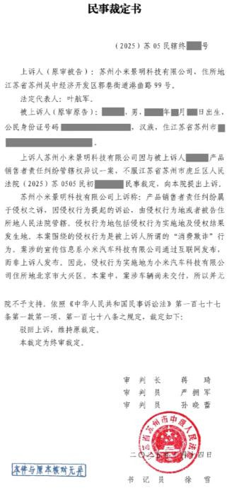 最终,一位律师车主选择通过法律途径维权,要求退还2万元定金,并按“退一赔三”原则索赔12.6万元及1万元律师费。江苏小米景明科技有限公司作为该案的第一被告,以小米汽车宣传主体在北京总部、侵权行为实施地在北京市大兴区为由提出管辖权异议,被一审法院驳回。后小米汽车上诉至江苏省苏州市中级人民法院,最终二审法院驳回小米上诉,维持原裁定。